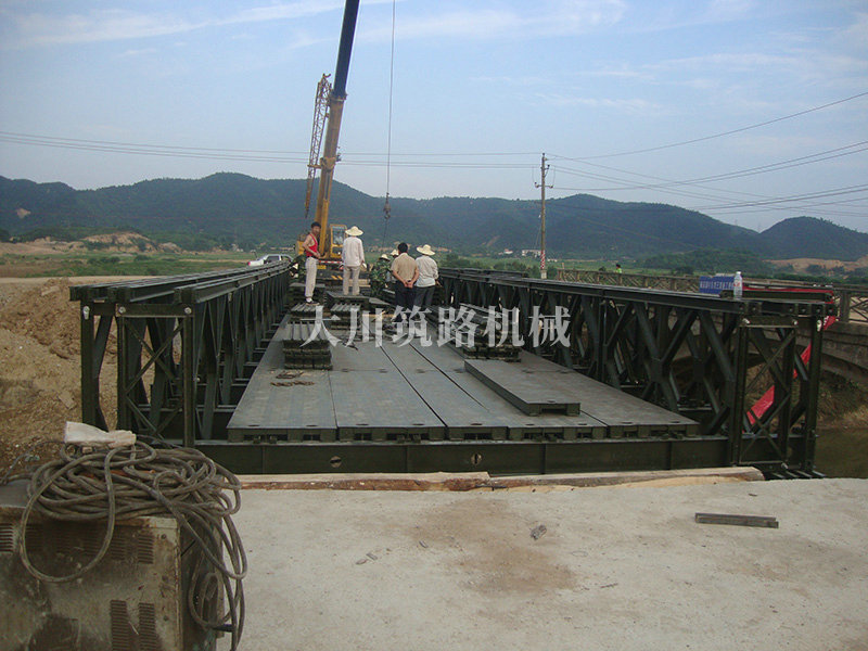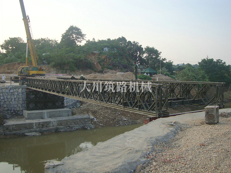 特點:本鋼橋由國防科技大學(xué)全程指導(dǎo)和監(jiān)督安裝,滿足荷載80T施工車輛通行,因施工場地要求,采用貝雷梁組合式橋墩,安裝拆除方便,穩(wěn)定性好。采用推出法安裝,安裝周期20天,于2011年5月25日通車。